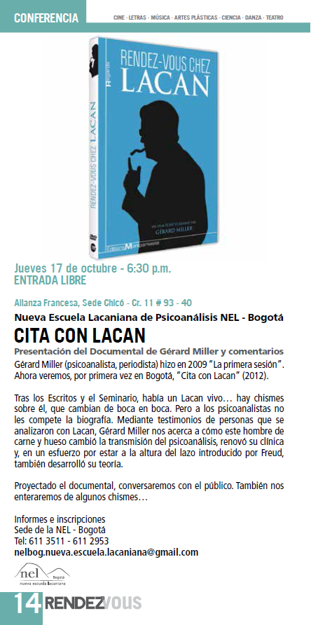 http://nel-amp.org/ La Biblioteca de la Nueva Escuela Lacaniana de Psicoanálisis NEL-Bogotá y La Alianza Colombo Francesa Invitan Noche de Biblioteca CITA CON LACAN Jueves 17 de octubre – 6:30 p.m. ENTRADA LIBRE Alianza Francesa, Sede Chicó – Cr. 11 # 93 – 40 Partagez cet article Catégorie : Sans classement15 de octobre de 2013Navigation articleArticles SimilairesUN-DIVIDUALISMO, Las nuevas respuestas del sujeto23 de février de 2025Billet du mois – février 20259 de février de 2025Falar com a criança! / ¡Hablar con el niño!4 de décembre de 2024Mondo#513 de septembre de 2024Psicoanálisis // Inteligencia artificial23 de juillet de 2024CORREIO 92 – ENTRADAS3 de juin de 2024